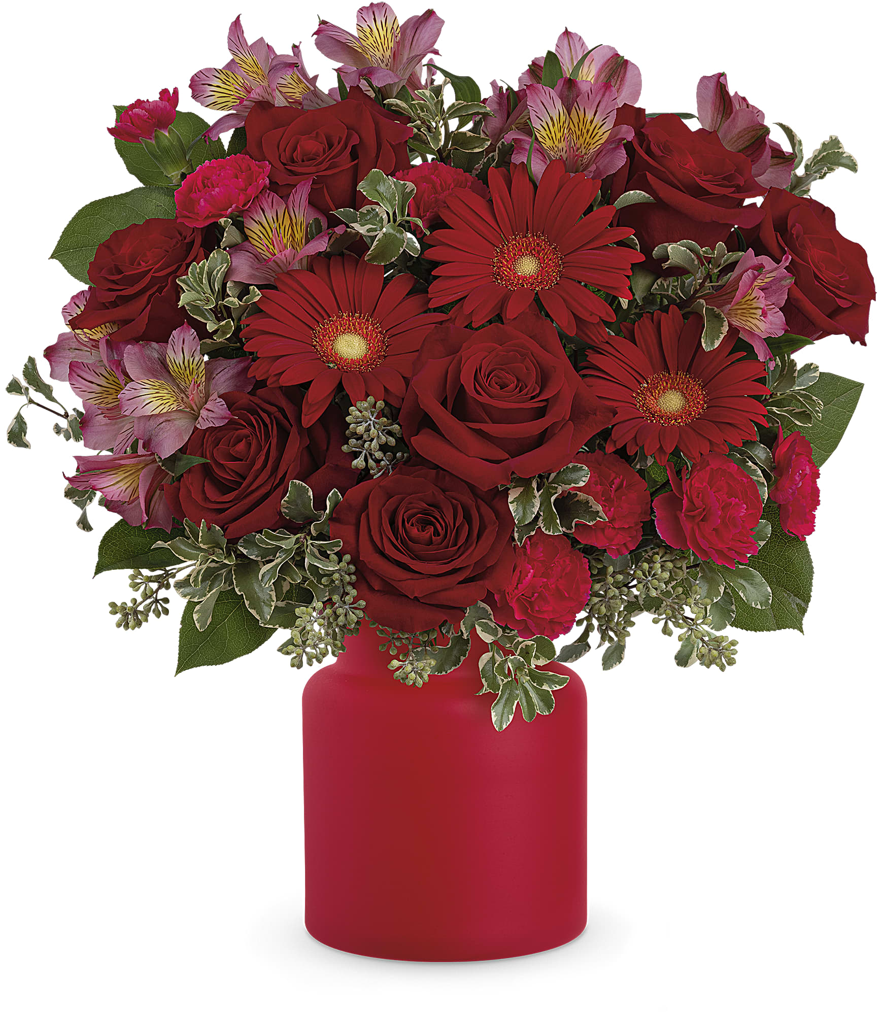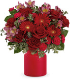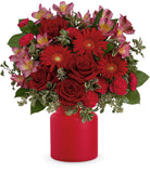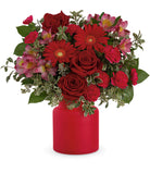 Experience pure magic with this vibrant red rose bouquet, adding a striking touch to any event, beautifully displayed in a whimsical frosted glass jar. Pairs perfectly with a premium greeting card and gift of a candle or artisan chocolates.