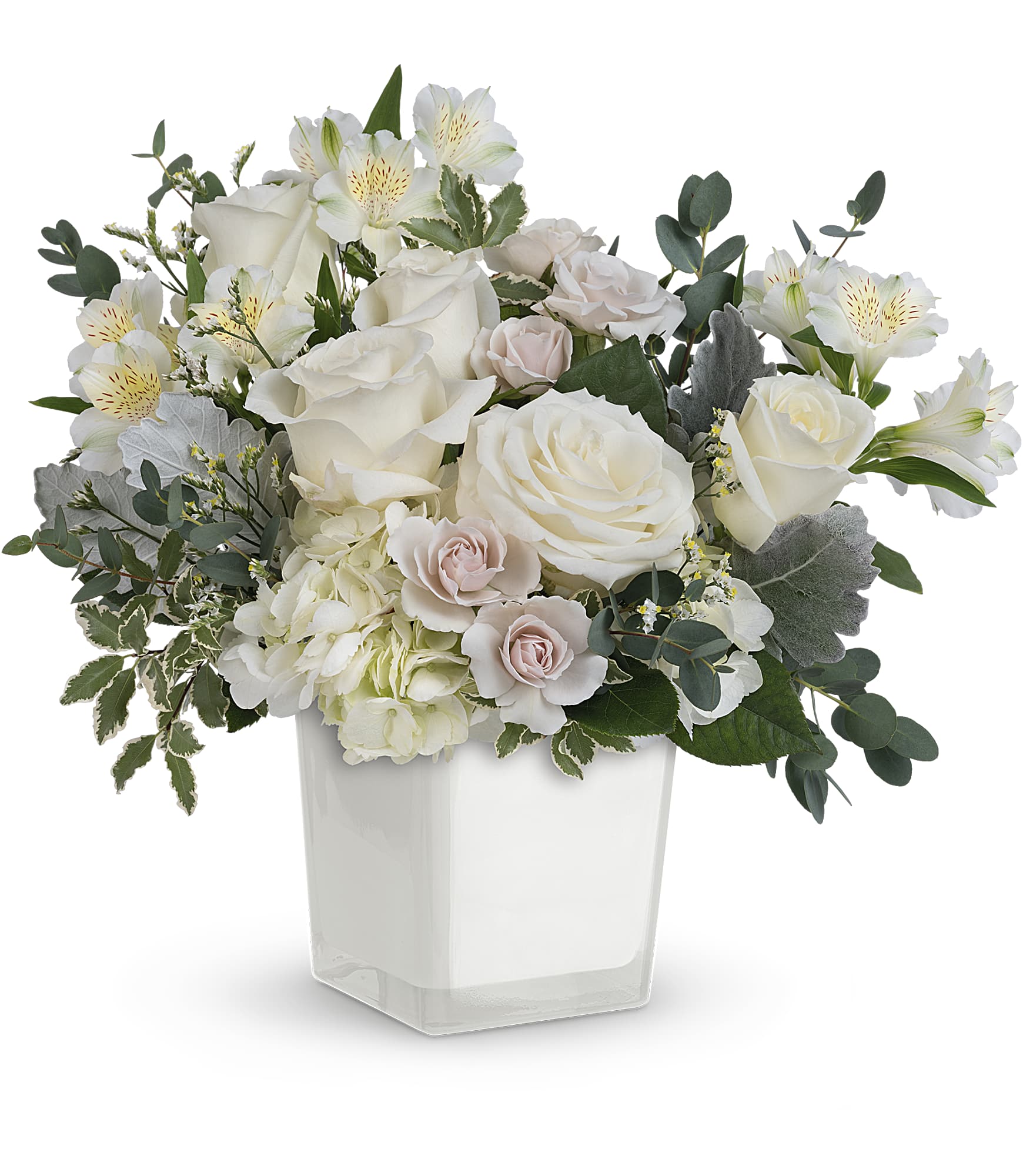 As serene as soft white clouds floating in a crisp blue sky, this elegant white rose bouquet in a simple glass cube brings peace and beauty to any occasion.
