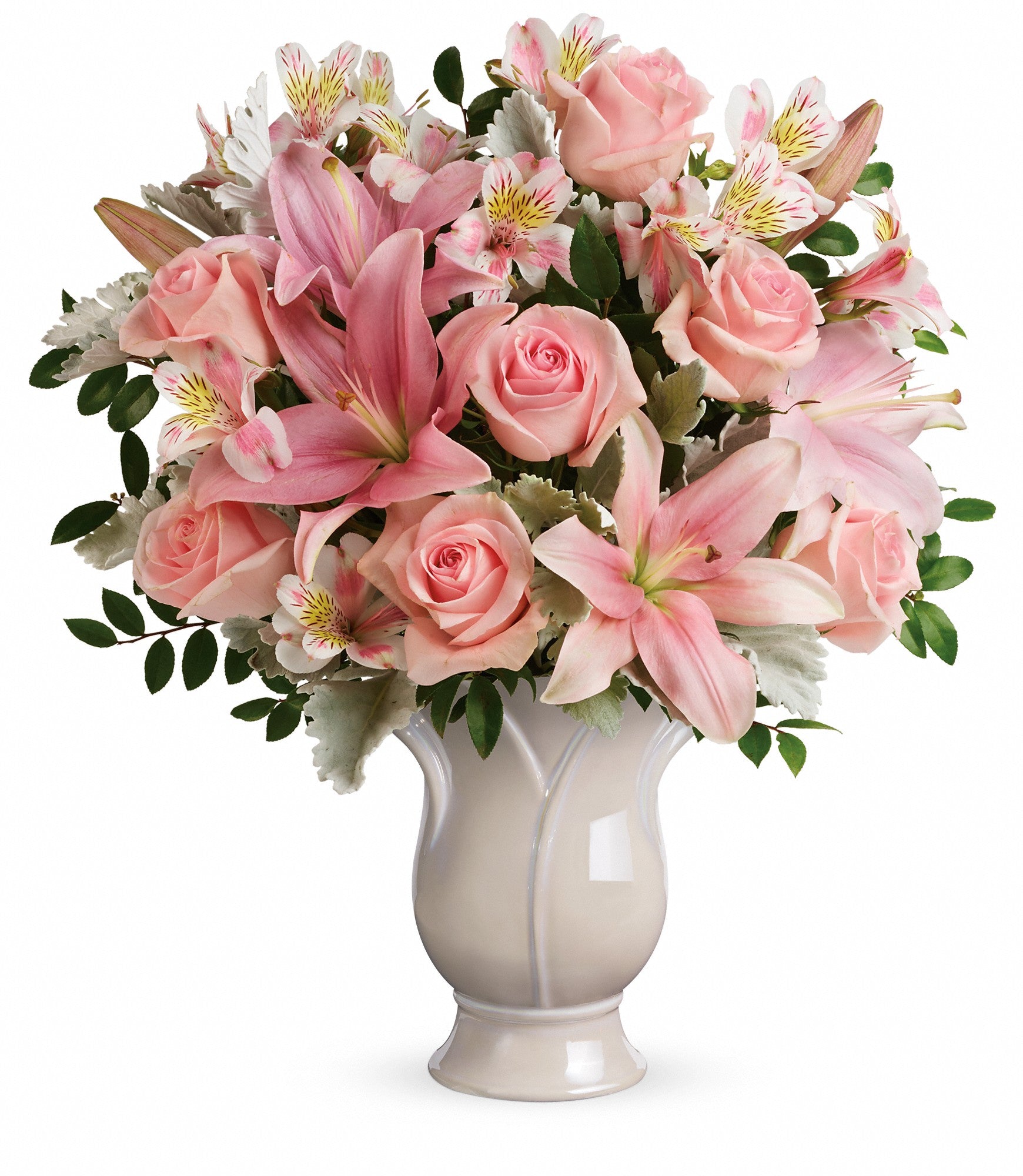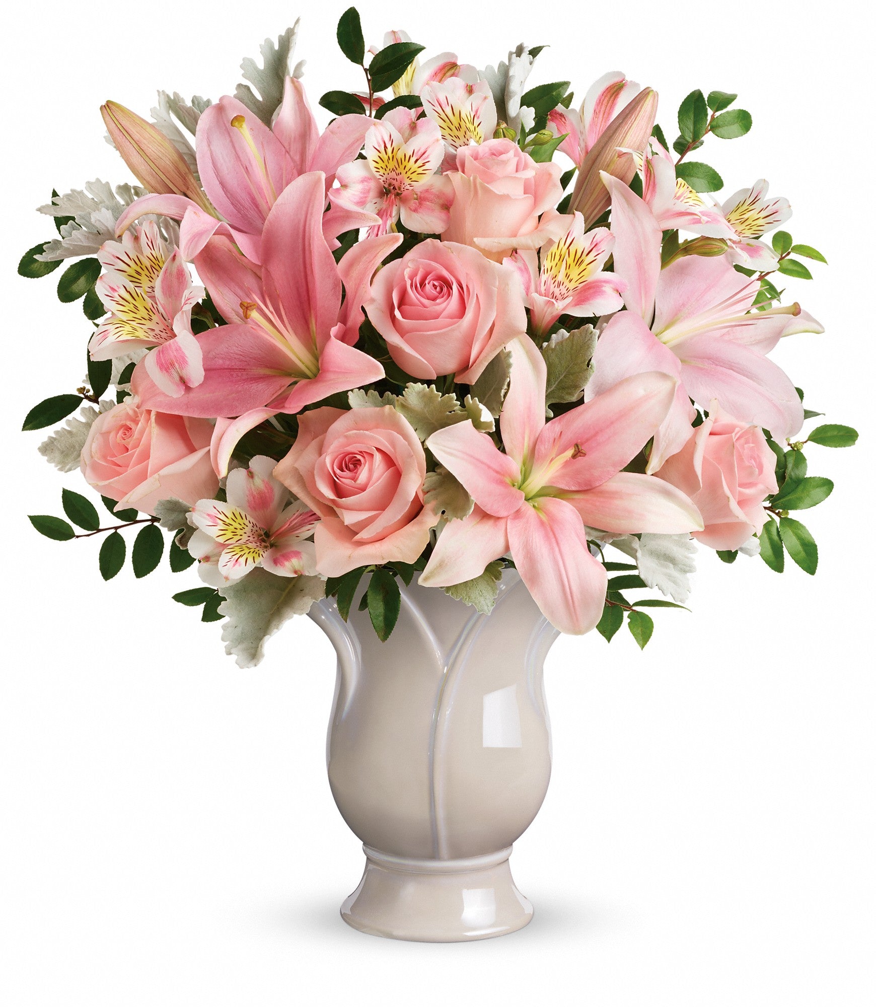 Roses, Lilies, & Alstromeria are accented with premium greens and delivered in a gorgeous ceramic vase with a slightly iridescent finish.