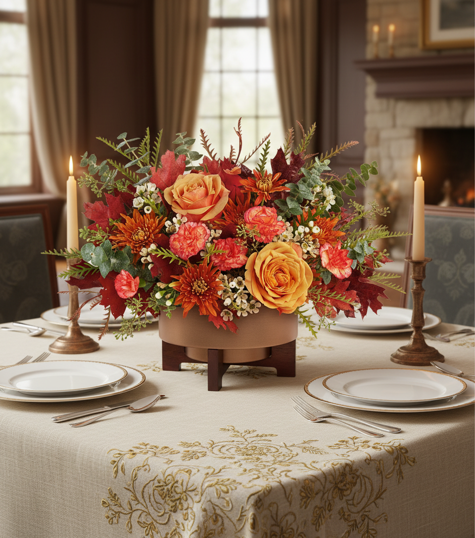 The Modern Copper Centerpiece highlights the beauty of fall through vibrant seasonal flowers, elegantly displayed in a stylish metal planter featuring a warm copper tone and a contemporary wooden base. It makes a perfect gift or an eye-catching decoration for Thanksgiving and autumn gatherings.