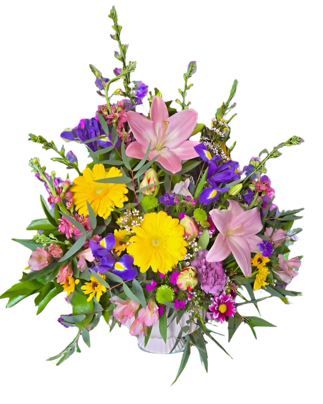A burst of color, this vibrant arrangement features sunny yellow gerbera daisies, soft pink lilies, rich purple blooms, and playful pops of magenta and green. Lush greenery and delicate filler flowers complete the look, making it perfect for brightening up any space or special moment.