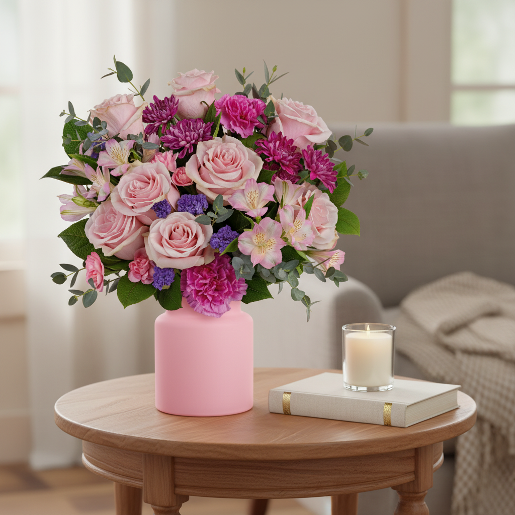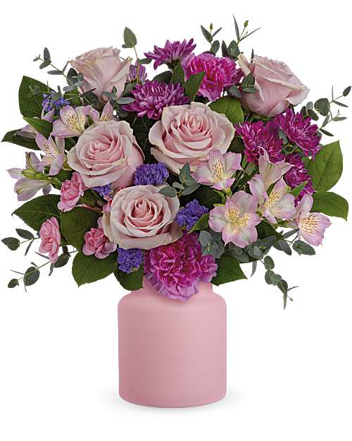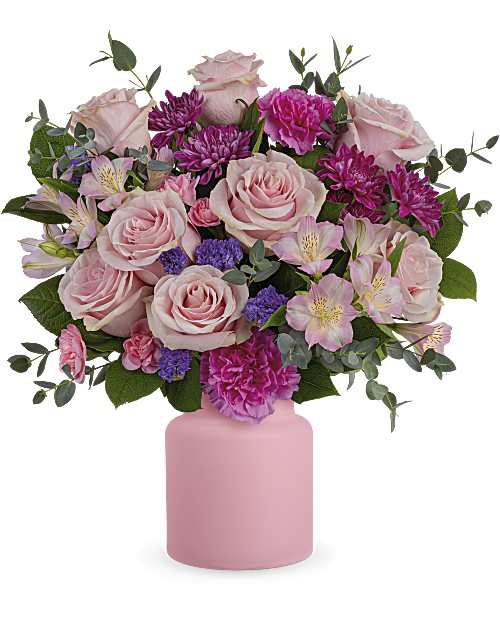 A stunning arrangement of pink roses and alstroemeria blended with vibrant carnations, delicate miniature carnations, and purple cushion spray chrysanthemums. Finished with purple sinuata statice, parvifolia eucalyptus, and lemon leaf for texture and lasting freshness.