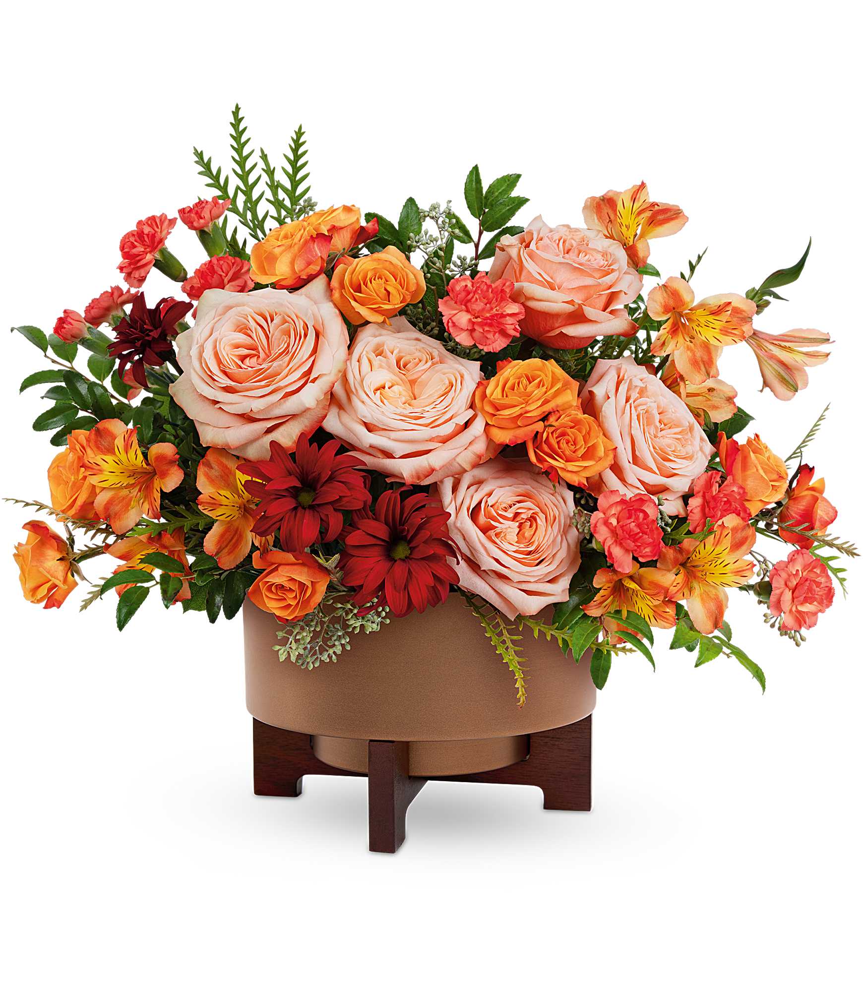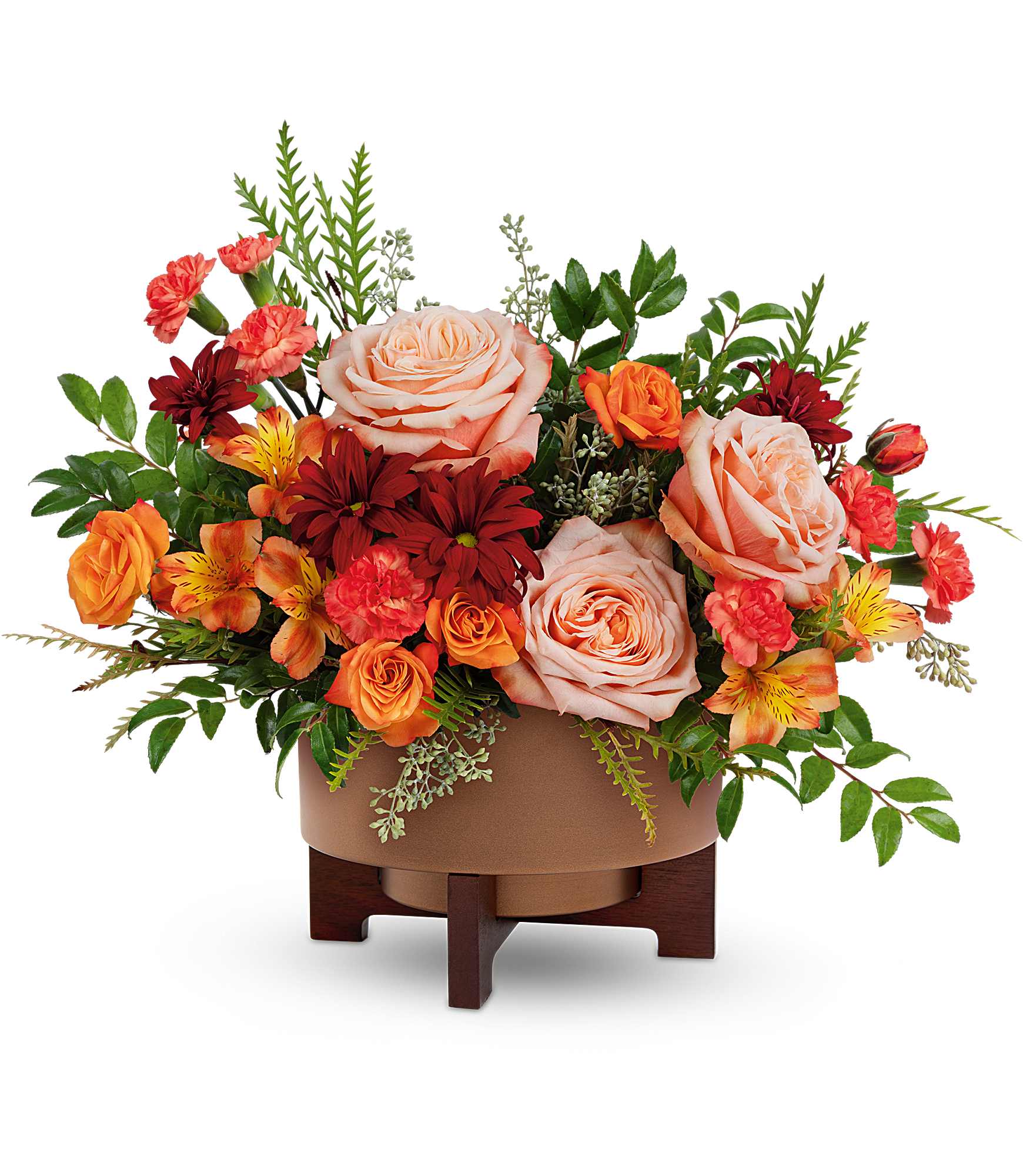 Celebrate the season with warmth and charm. Teleflora's Copper Celebration Centerpiece captures fall's cozy glow with rich fall blooms and lush textures, beautifully arranged in a copper-finished planter with wooden stand-perfect for Thanksgiving gatherings and autumn moments.