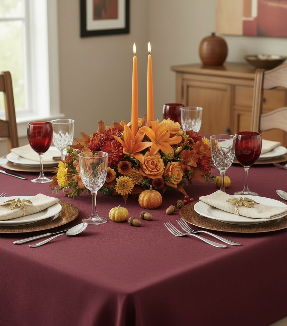 As your loved ones gather around the table, they'll bask in the warm glow of two orange taper candles surrounded by a fantastic array of fall flowers.