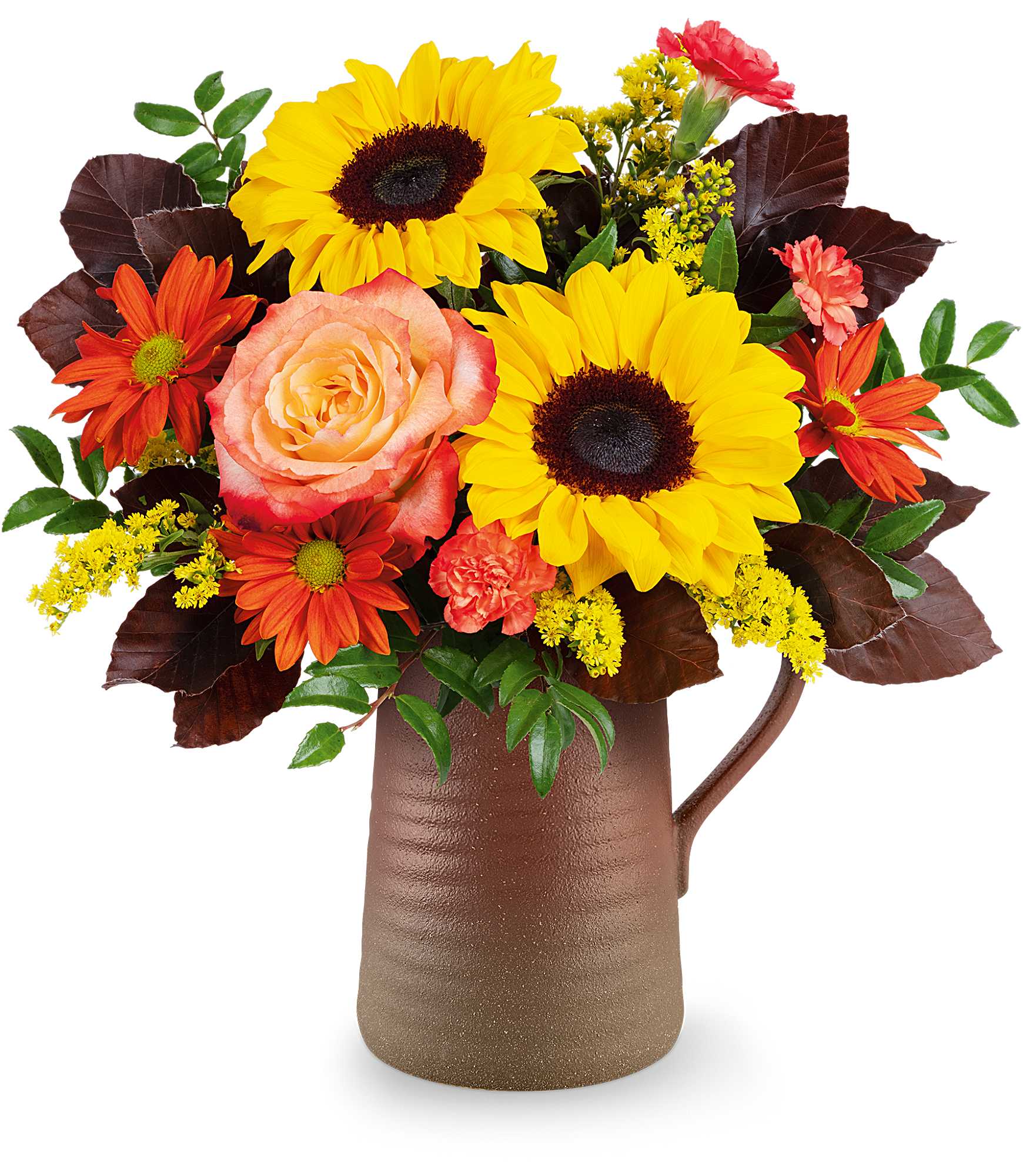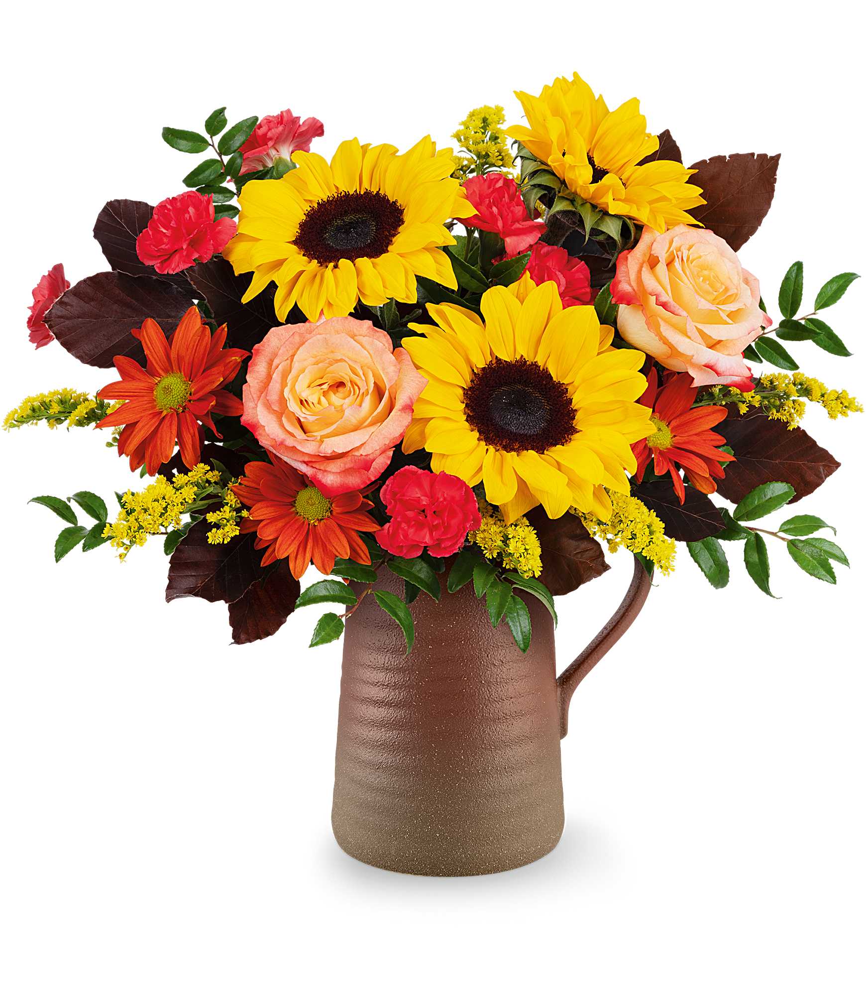 Celebrate the season with Teleflora's Sunburst Harmony Bouquet. Featuring cheerful sunflowers, rich bronze daisies, and warm fall tones in a rustic stoneware pitcher, it's a perfect pick for Thanksgiving gatherings, hostess gifts, or seasonal décor.