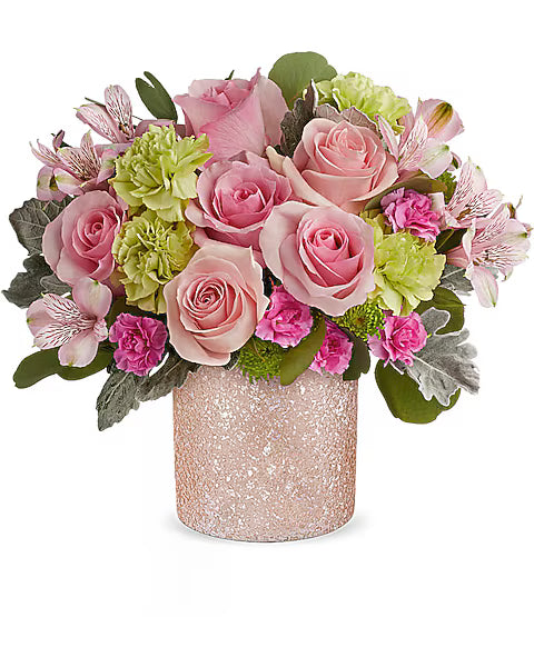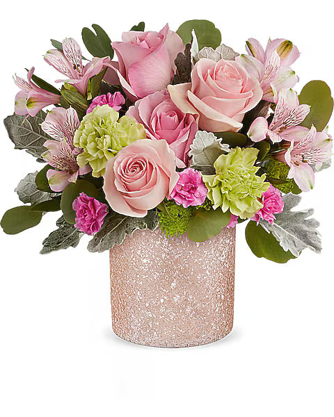 Make her day sparkle with our ballet pink glass cylinder that radiates elegance. This bouquet features pink roses, light pink alstroemeria, green carnations, dark pink miniature carnations, green cushion spray chrysanthemums, silver dollar eucalyptus, and dusty miller.