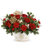 Snowflake Symphony Centerpiece features vibrant red roses, classic red carnations, and miniature red carnations, along with variegated holly, noble fir, and cedar. This holiday bouquet is beautifully arranged in a Snowflake Symphony Bowl, adding a touch of festive elegance to any celebration.