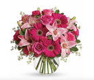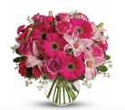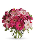 Lovely pink roses and asiatic lilies are joined by hot pink gerberas and miniature carnations, pink full-sized carnations and more in a clear glass vase.
