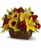 Here's a golden opportunity to make someone's day. Just send this delightful basket of fresh fall flowers to someone who's on your mind and you can be sure it will lift their spirits!