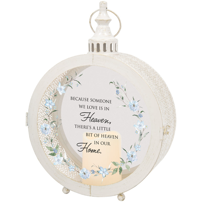 These lanterns are made a high-quality metal finish and uv printed glass artwork with sentiment. The flameless LED candle features a built-in automatic timer 6 hours ON/18 hours OFF. 3 AAA batteries are not included. Indoor use only