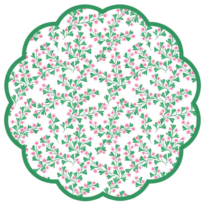 Our Cherry Blossom Scalloped Paper Placemats feature delicate pink blossoms and lush green vines, all framed with a soft green border for that extra pop of color. Perfect for spring brunches, garden parties, or any moment that calls for a little charm. Layer it with your favorite tableware or let it shine on its own—either way, it's an effortless way to elevate your table (with no laundry required!).