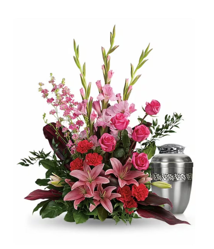 Share your heartfelt feelings on the loss of someone special with this feminine arrangement of pink roses, lilies and gladioli. It's a rich reminder of your love at the memorial service.