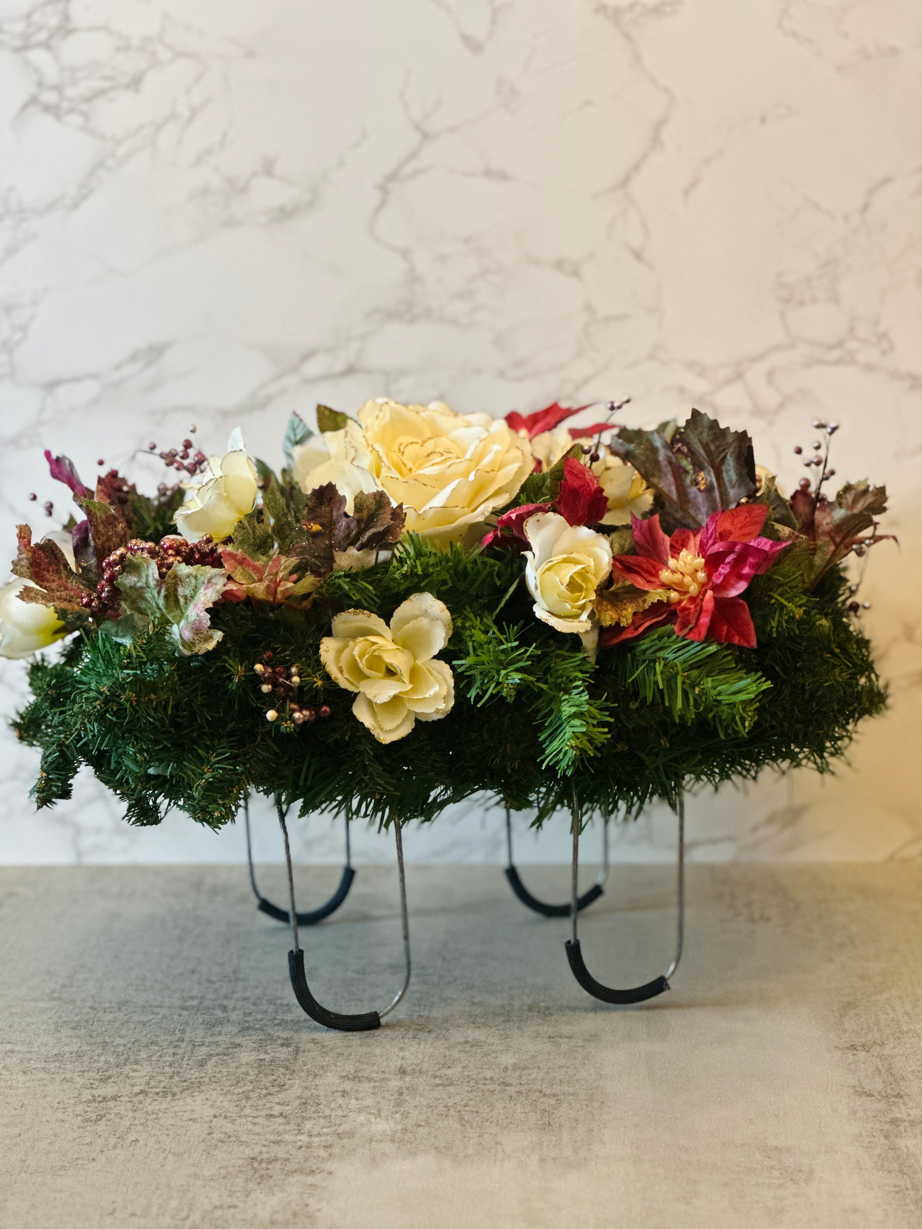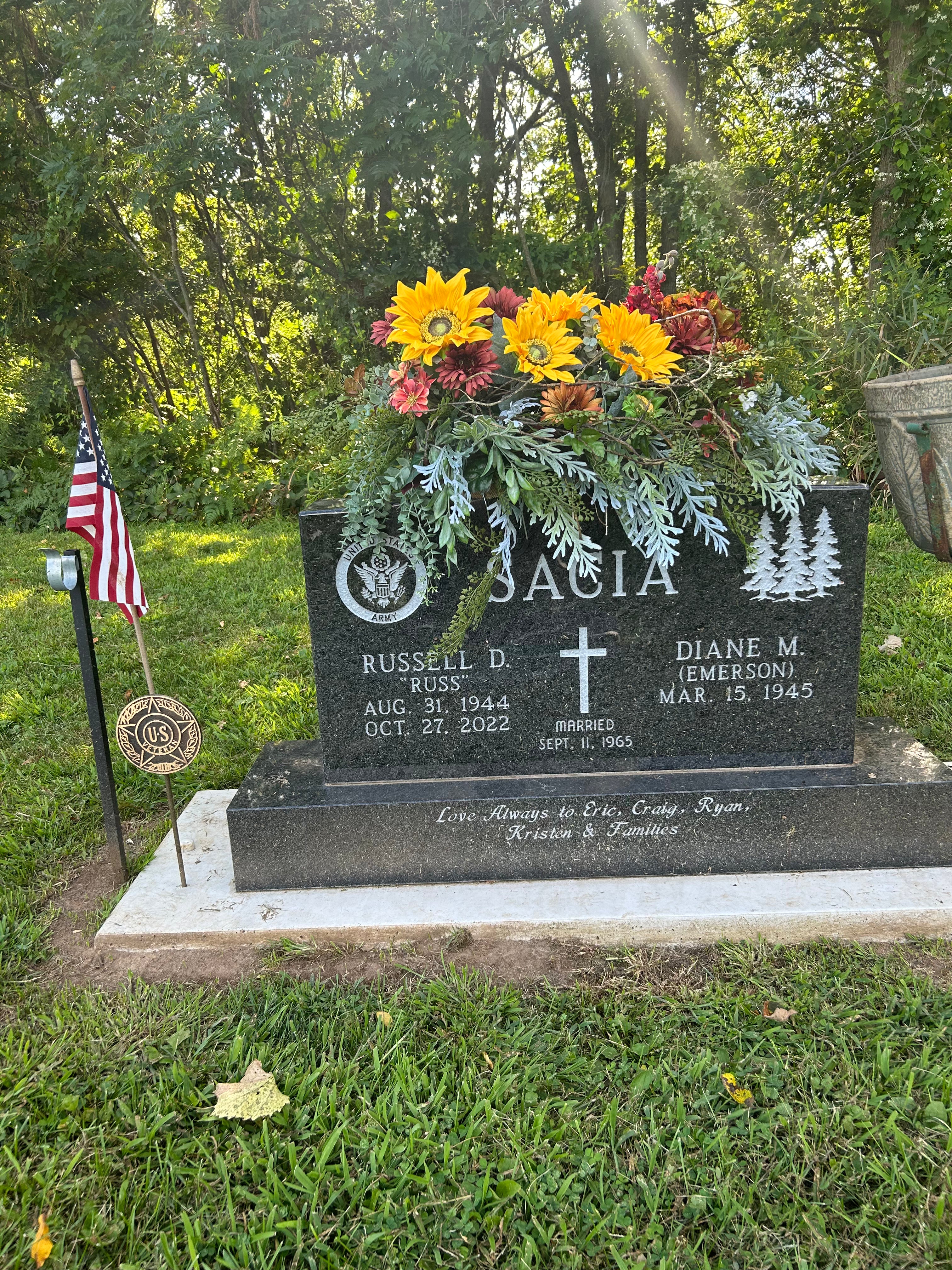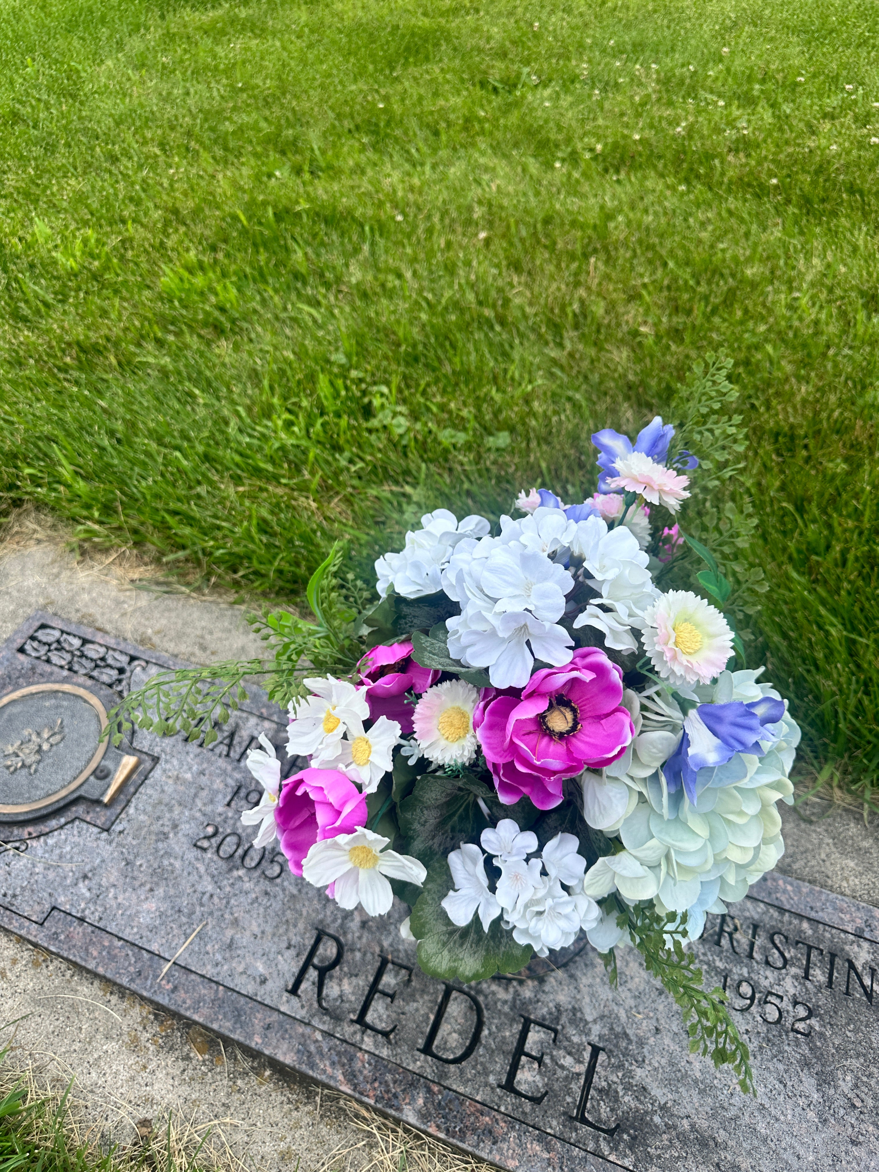Honor your loved one's memory with a custom cemetery design, tributes that are really some of the most special we do.  We are proud to customize a thoughtful design for your loved one seasonally or to commemorate special occasions.  We over many styles depending on the site itself -including monument saddles that sit atop the stone, Floral Urn inserts that fit into freestanding urns or vessels built into the stone itself, or a freestanding ground vase we can design into that's made with durable metal that won't be damaged by string trimmers and mowers. Let us create a special tribute for your loved one today.  We are honored to place tributes at all area cemeteries each season.