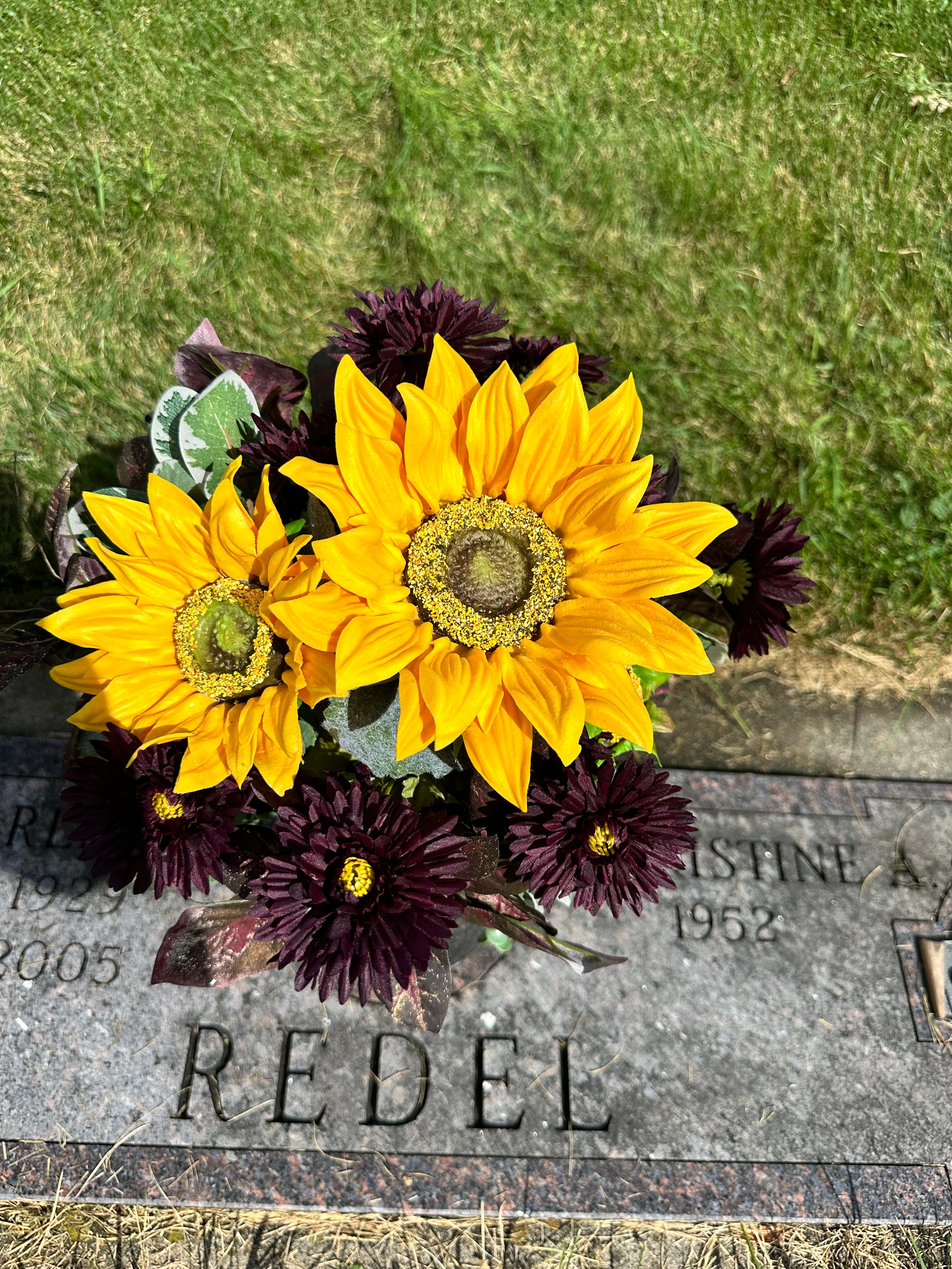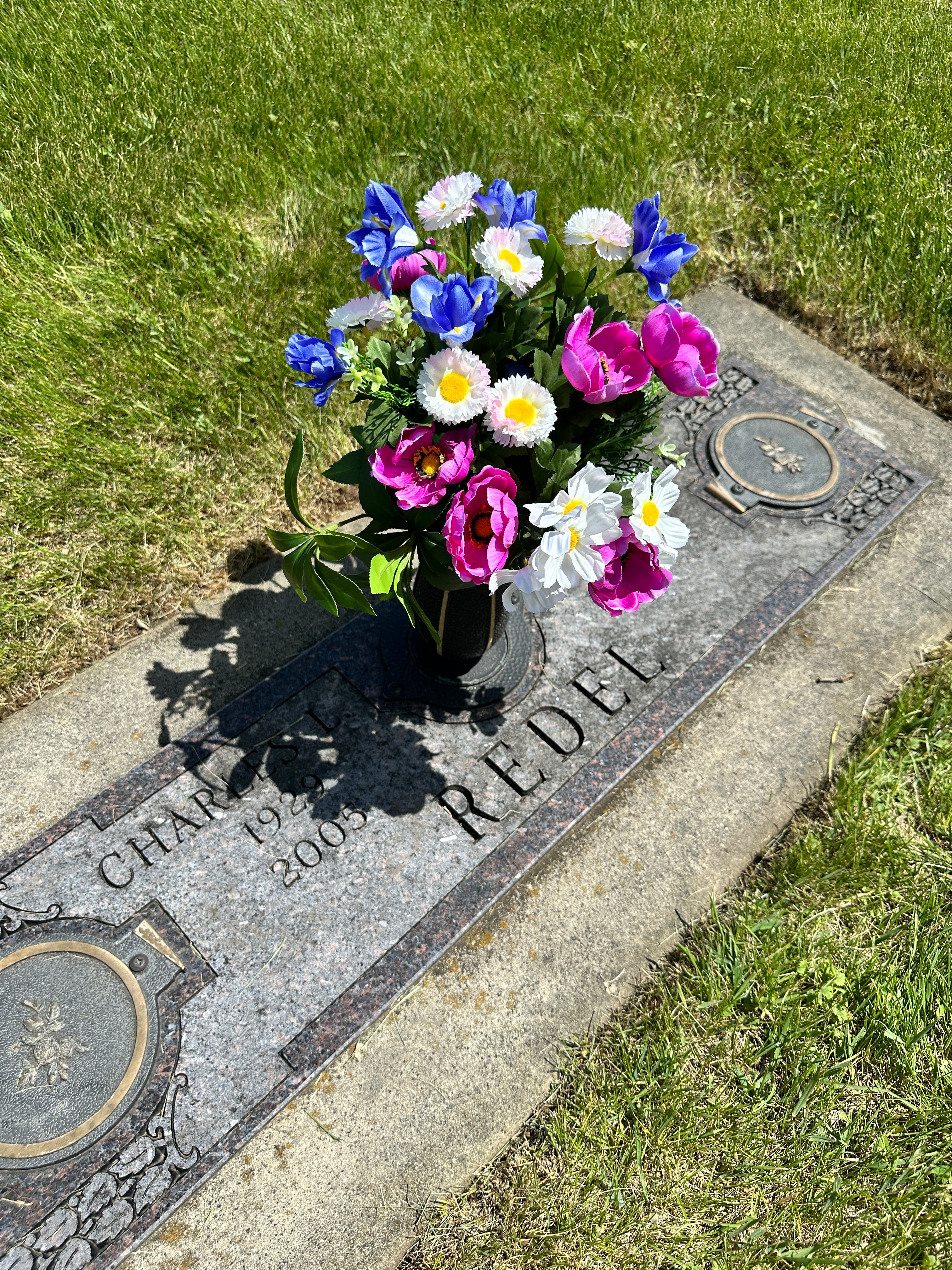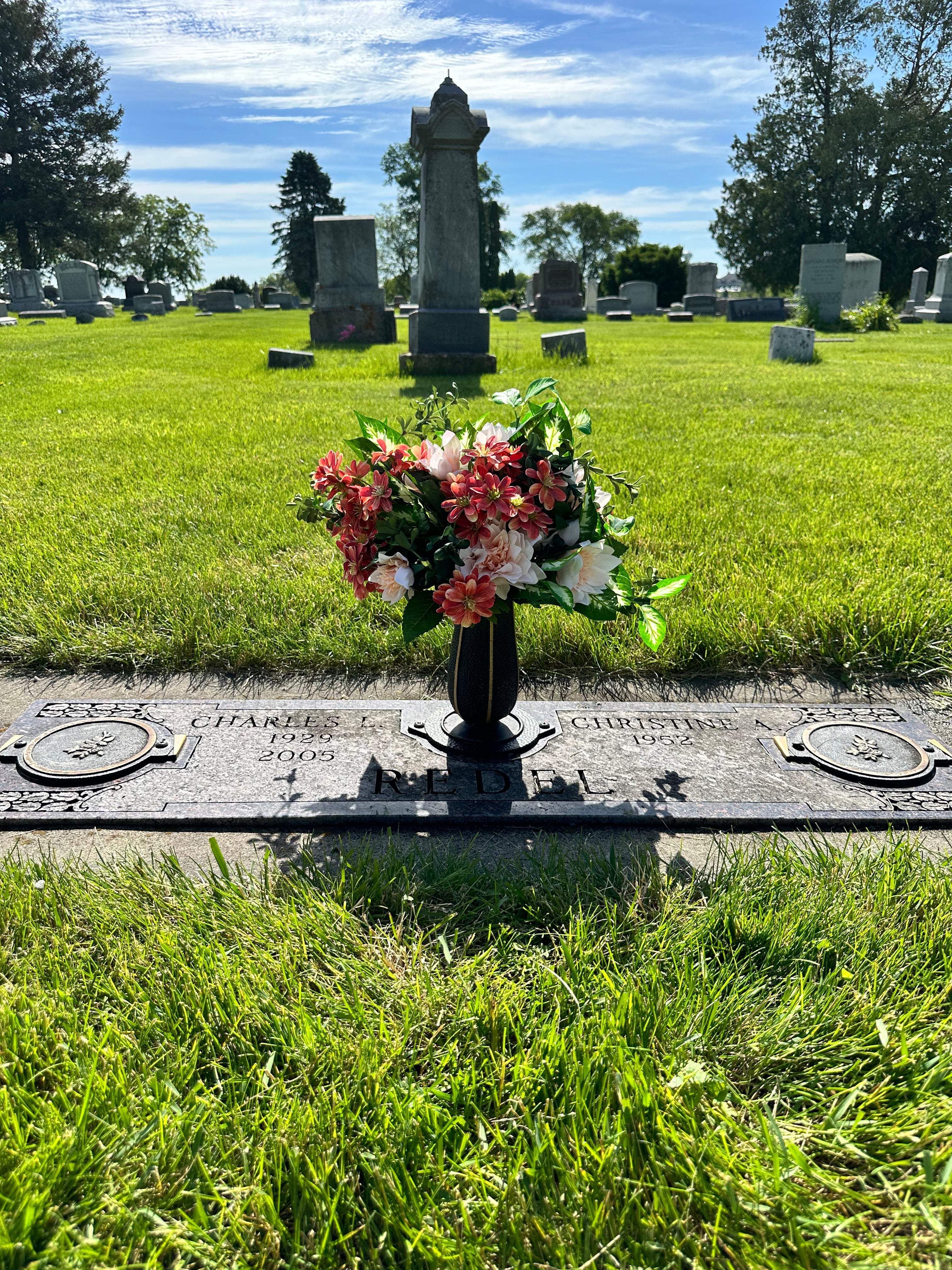 Honor your loved one's memory with a custom cemetery design, tributes that are really some of the most special we do.  We are proud to customize a thoughtful design for your loved one seasonally or to commemorate special occasions.  We over many styles depending on the site itself -including monument saddles that sit atop the stone, Floral Urn inserts that fit into freestanding urns or vessels built into the stone itself, or a freestanding ground vase we can design into that's made with durable metal that won't be damaged by string trimmers and mowers. Let us create a special tribute for your loved one today.  We are honored to place tributes at all area cemeteries each season.