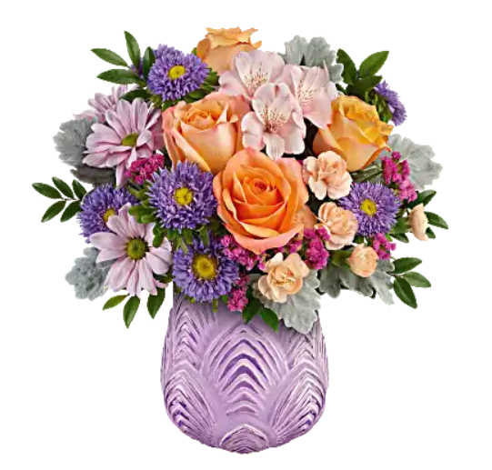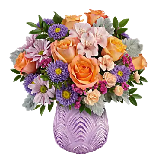 This bouquet showcases peach roses, light pink alstroemeria, miniature peach carnations, lavender Matsumoto asters, and lavender daisy spray chrysanthemums, all beautifully complemented by raspberry statice, huckleberry, and dusty miller.