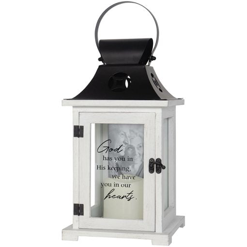 Our Picture Frame Lanterns are made from quality composite wood and a black metal top. They feature a built-in 4" x 6" picture frame along with an automatic timer which runs for 6 hours on and 18 hours off(3-AAA batteries are NOT included) and are inscribed with sentimental quotes. DO NOT use fire burning candles in the lanterns. Suitable for hanging or free-standing use inside. Recommended as an accent in floral arrangements for many occasions!