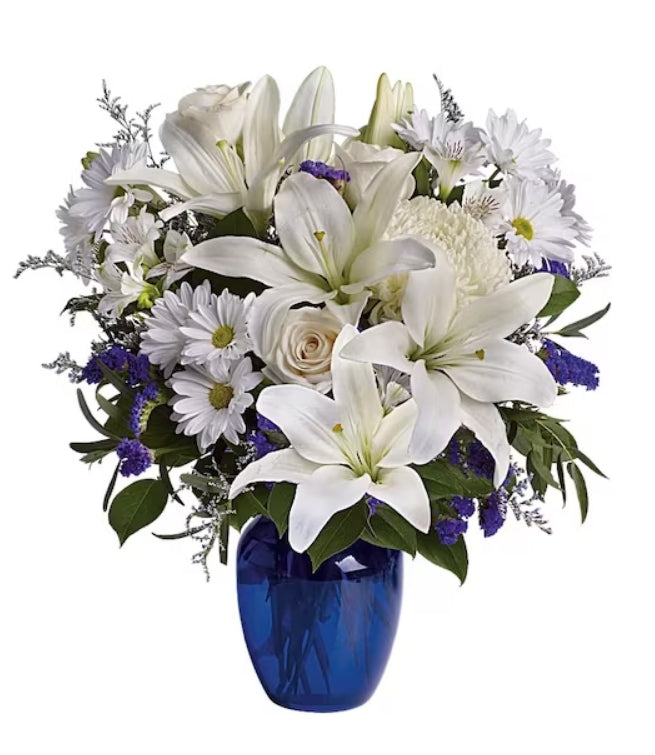 In this arrangement, the serenity of the color blue along with the purity of intention symbolized by white will let the family know you are sending your calm strength to them during these difficult times.