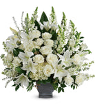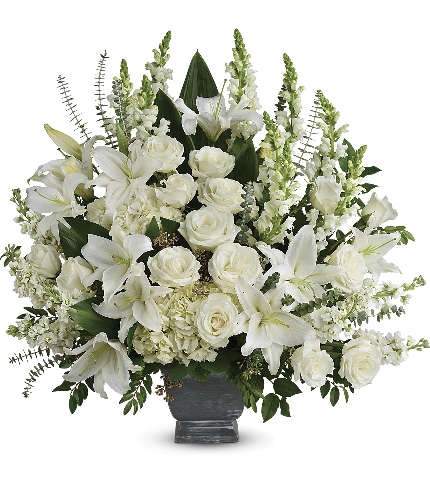 When grief feels overwhelming, this serene arrangement of white hydrangea, roses, and lilies provides a gentle reminder of brighter days ahead. Its luminous blooms convey compassion and renewal, making it a meaningful way to honor a life well-lived and support those left behind.