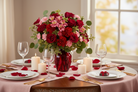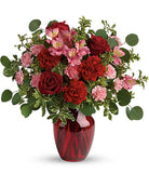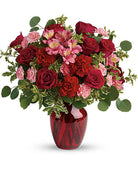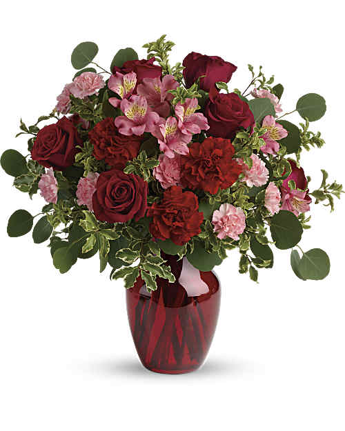 Red roses, pink alstroemeria, red carnations, and pink miniature carnations are accented with silver dollar eucalyptus and pitta negra. Delivered in a ruby rose vase.