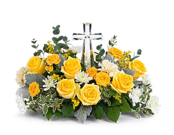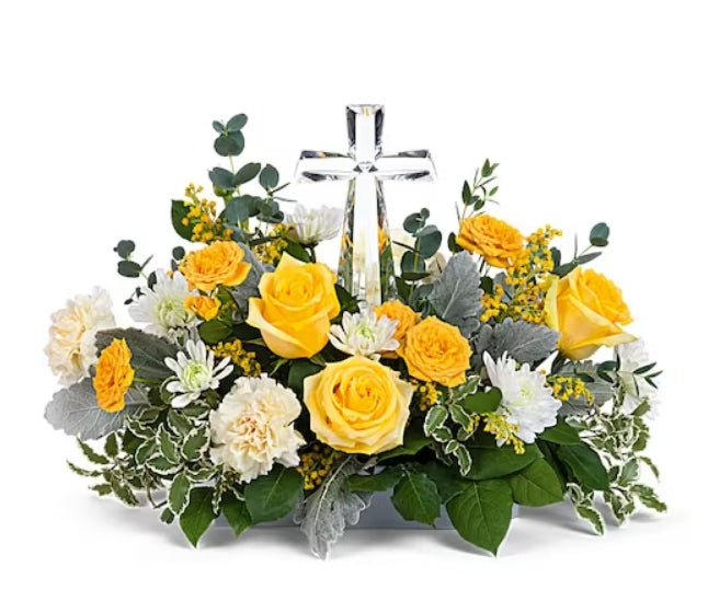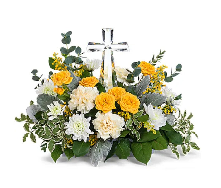 This hopeful arrangement includes spray roses, light yellow carnations, white cushion spray chrysanthemums, solidago, parvifolia eucalyptus, pitta negra, dusty miller and lemon leaf. Delivered with a Small Crystal Cross.