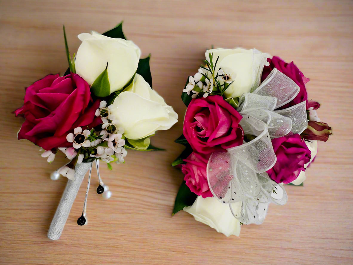 This coordinating wrist corsage and boutonniere set features a beautiful mix of dark pink and white spray roses, complemented by delicate wax flowers. The rich, deep pink roses bring a bold yet romantic touch, while the soft white roses and wax flowers add a sense of lightness and grace. Together, they create a harmonious balance of vibrant color and subtle elegance, making it the perfect accessory for weddings, proms, or any special occasion.