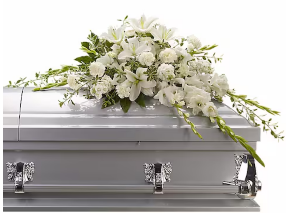 A casket spray made of all white flowers and simple greenery is a simply stunning way to honor the deceased while bringing a quiet strength and serenity to those present.