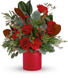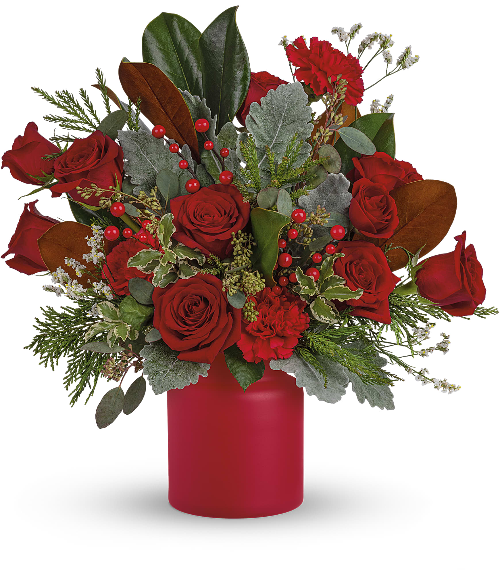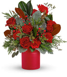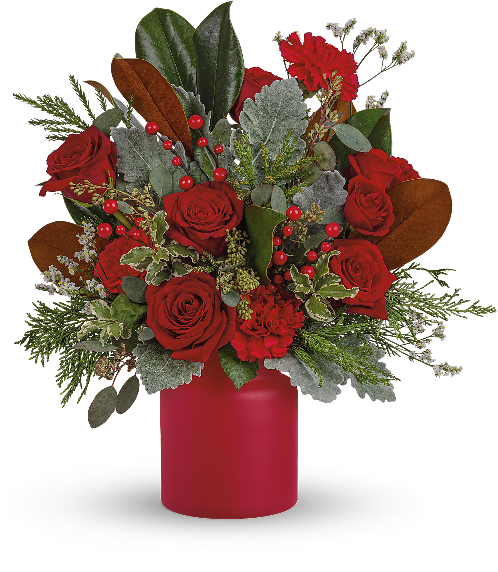 Experience pure magic with this fresh holiday arrangementt, adding a striking touch to any event, beautifully displayed in a whimsical frosted glass jar. Pairs perfectly with a premium greeting card and gift of a candle or artisan chocolates.