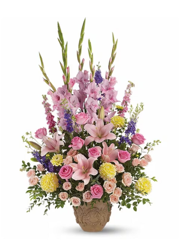 Not at all somber are these abundant blooms of pink, yellow and lavender, gracefully arranged in a container that is equally suitable for a memorial service or one's home.