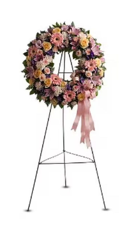 A graceful, feminine wreath created with a range of beautiful blossoms in peach, pink, crème and lavender is a lovely depiction of your warm feelings and devotion. Delivered on an easel, for display at a funeral service or wake. A standing wreath created from fresh flowers such as roses, Asiatic lilies, carnations, limonium, gerbera and larkspur – in shades of peach, pink, lavender and crème – is delivered on an easel.