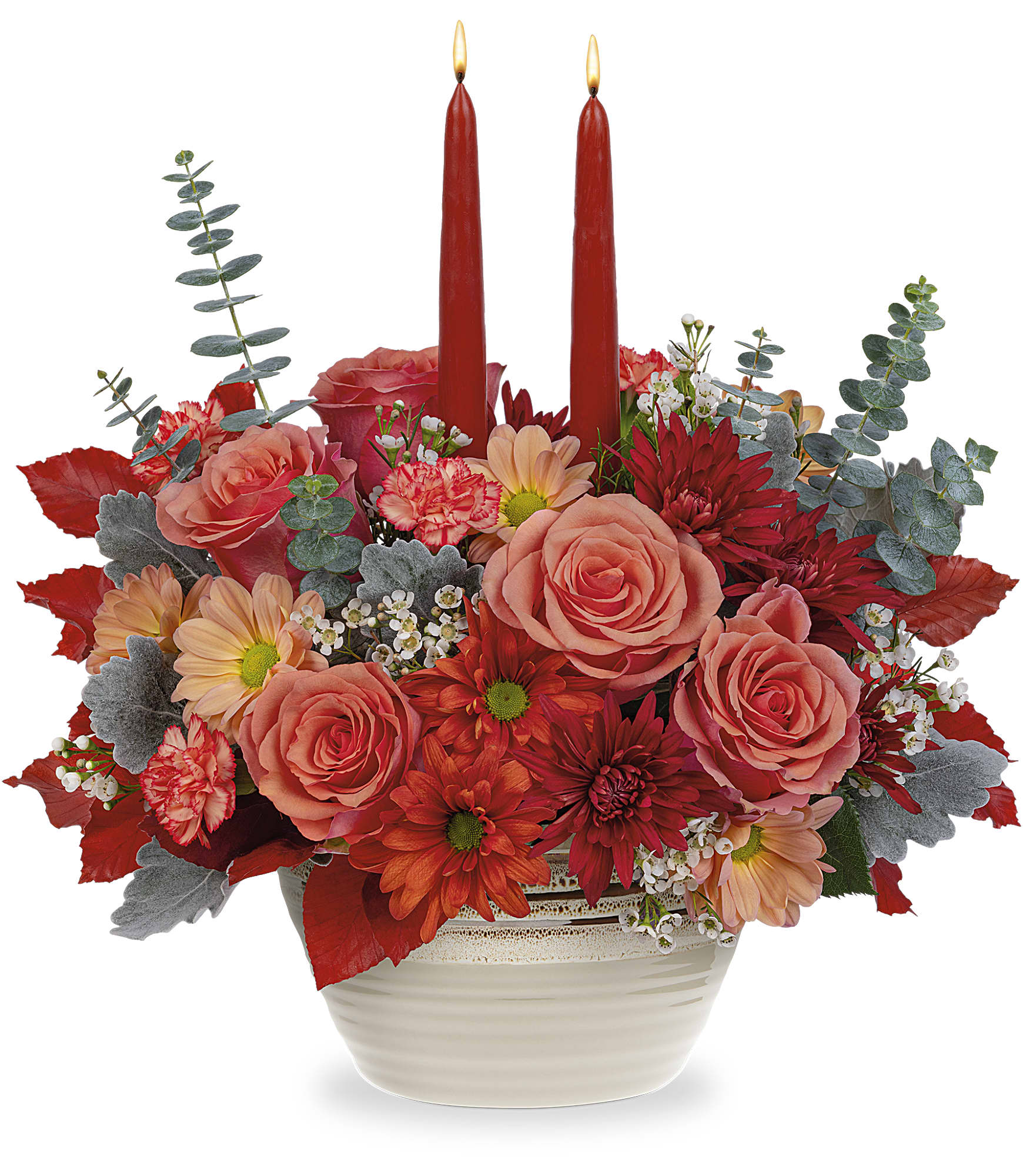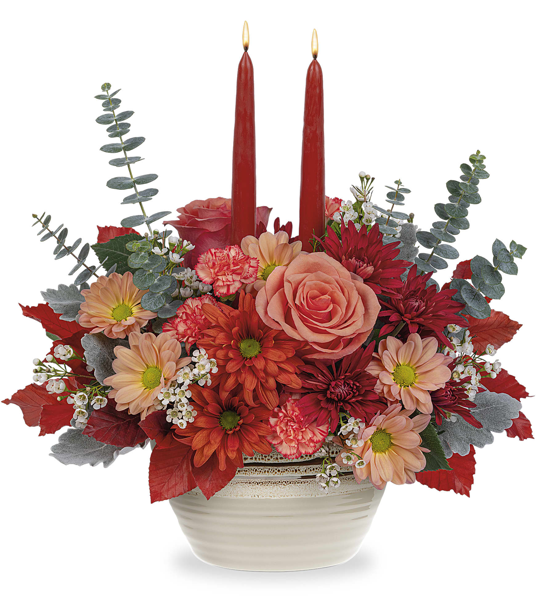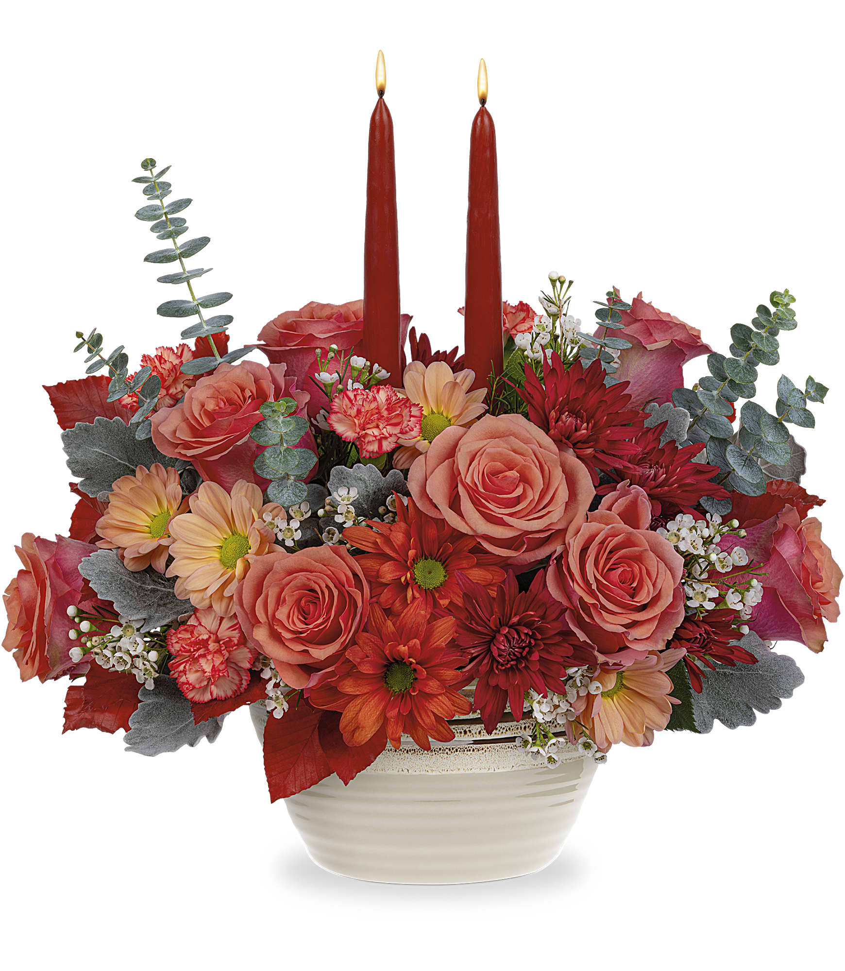 Add warmth to your fall celebrations with this artisanal stoneware serving bowl centerpiece, featuring vibrant orange flowers perfectly complemented by softly glowing tapers. Ideal for Thanksgiving or any special event.