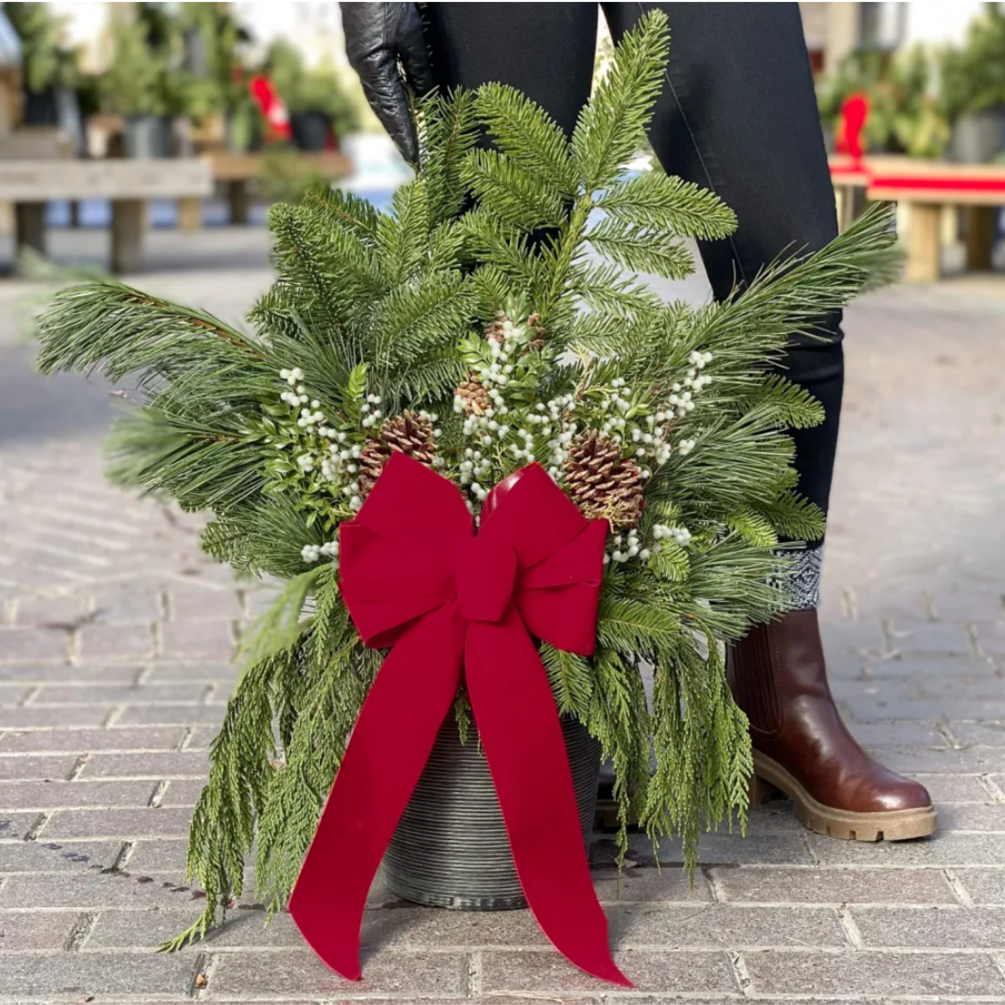 Each porch pot is carefully crafted with the freshest balsam and evergreens to ensure long-lasting beauty throughout the holiday season. Weather-resistant and designed to thrive outdoors.