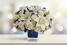 Luxurious crème roses and pure white lilies paint a peaceful picture inside a sapphire blue cube.