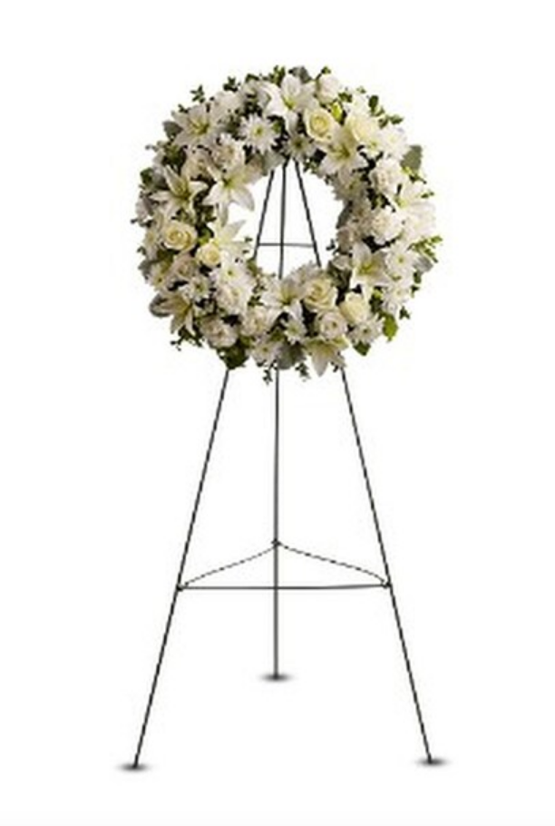 A ring of fragrant, bright white blossoms will create a serene display at any funeral or wake. This classic wreath is delivered on an easel, and is a thoughtful expression of sympathy and admiration. A standing wreath created from fresh white flowers such as roses, Asiatic lilies, carnations and cushion spray chrysanthemums – accented with greenery – is delivered on an easel.